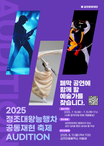 오디션 참가 신청은 7월 15일부터 31일 17시까지 접수 가능하다. 신청 방법은 금천문화재단 누리집의 공지사항 또는 온라인 링크(https://naver.me/5TQSF2yF)로 참여하면 된다.
